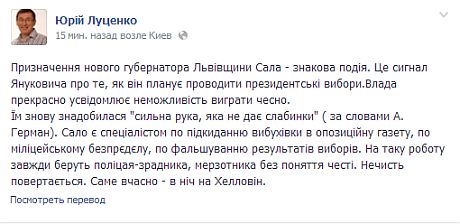 "Призначення нового губернатора Львівщини Сала - знакова подія. Це сигнал Януковича про те, як він планує проводити президентські вибори. Влада прекрасно усвідомлює неможливість виграти чесно", - вважає Луценко.