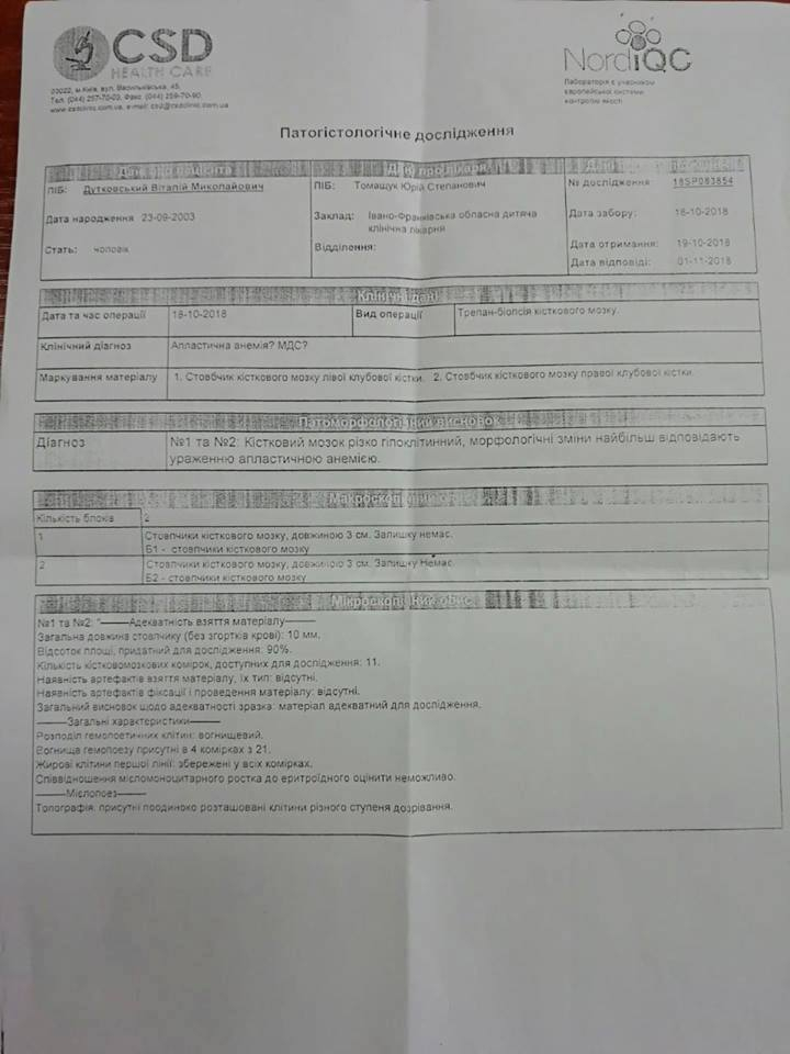 Коли Віталік зблід, мама вирішила здати аналізи. Вони показали дуже низькі тромбоцити та гемоглобін. Результати біопсії були невтішними.