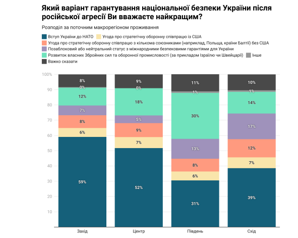Разом з тим 8% респондентів із Заходу вважають, що надійніше буде укласти угоду про стратегічну оборону з декількома країнами, за винятком США.
