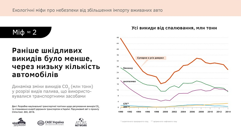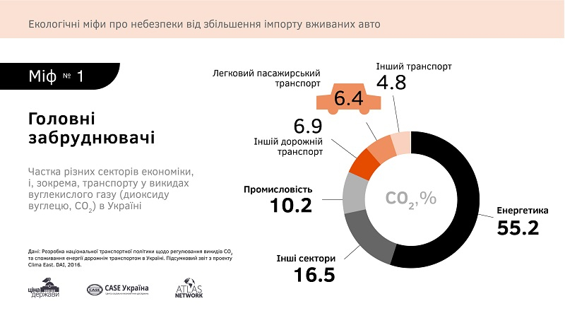 І, по-третє, український легковий автопарк створює лише 6,5 % всіх викидів у нашій країні. Основним забруднювачем повітря є енергетичний сектор, який продукує 55,2 % викидів.