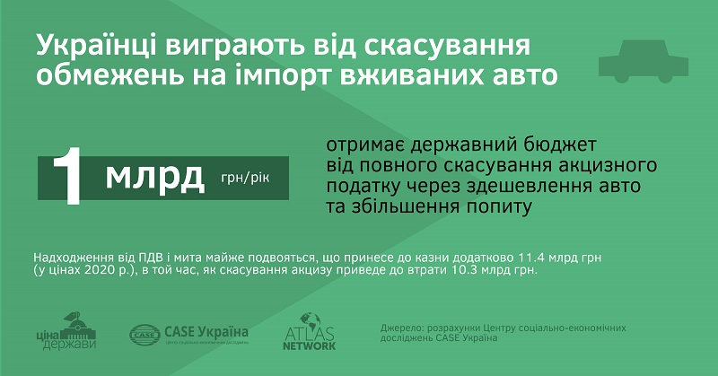 За словами співавтора дослідження старшого економіста CASE Україна Володимира Дубровського, згідно із розрахунками, ліквідація “вікового” акцизу збільшить імпорт машин удвічі – до 700 тис. на рік.