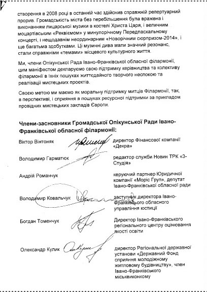 "Ми, члени Опікунської Рада Івано-Франківської обласної філармонії, цим маніфестом декларуємо свою підтримку керівництва та колективу філармонії в їхніх пошуках життєдайного творчого неспокою та реалізації мистецьких проектів. Своєю метою ми маємо як моральну підтримку митців Філармонії, так, в перспективі, і сприяння в пошуках ресурсної підтримки за прикладом провідних мистецьких закладів Європи", - мовиться в оприлюдненому Маніфесті Опікунської Ради.