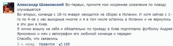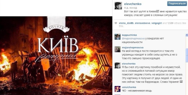 Екс-хавбек збірної України та ряду голландських клубів запостив революційну картинку "Київ вечірній", а потім усе розклав по поличках: "Я бы счел эту картинку похабной и неуместной, но в сложившейся патовой ситуации юмор помогает людям стоять на морозе за свои права. Эту картинку я получил от двух людей. И один из них сейчас там на баррикадах. Слава Украине!"