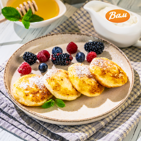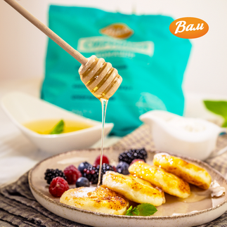 • Мед – рекомендуємо обрати рідкий мед, щоб він розтікався по всій поверхні сирничків, доповнюючи їх ніжну текстуру