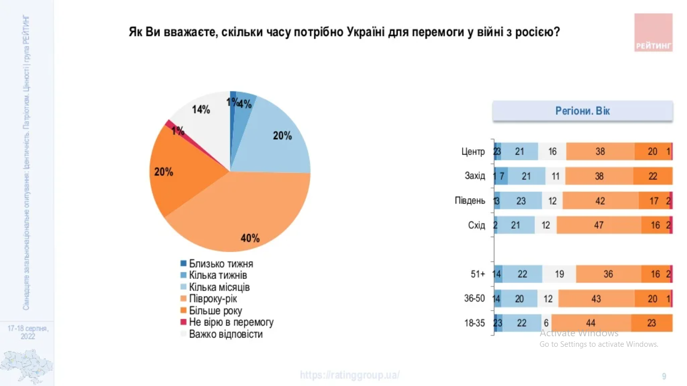 Сьогодні більшість українців — 60% — вважають, що для перемоги потрібно не менше пів року, 20% — вважають, що необхідно понад рік, 40% — півроку-рік. Водночас майже чверть оцінюють необхідний для перемоги час до кількох місяців.