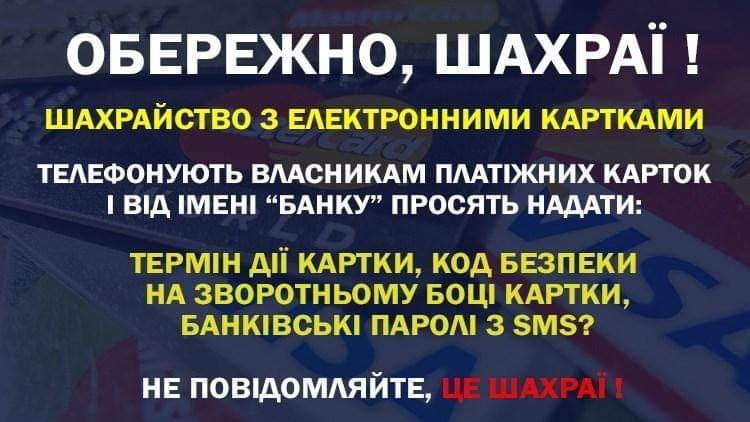 - за жодних обставин не розголошуйте конфіденційну інформацію (пін-код, номер картки), за допомогою якої зловмисники можуть привласнити ваші кошти;