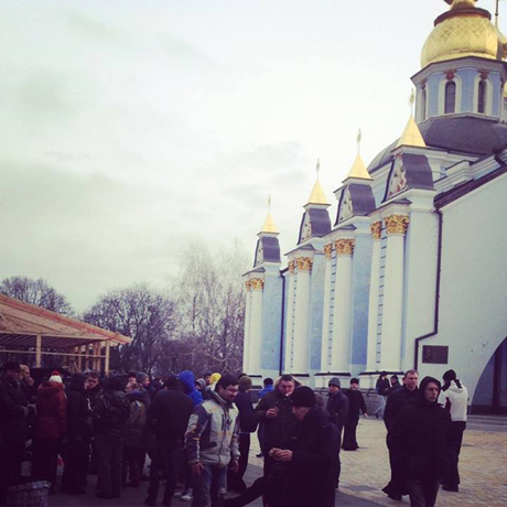 За інформацією депутата Київради Олексія Давиденка, зараз все більше людей приходить в Михайлівський собор, де люди зсередини забарикадувалися від влади лавками і співають гімн України.