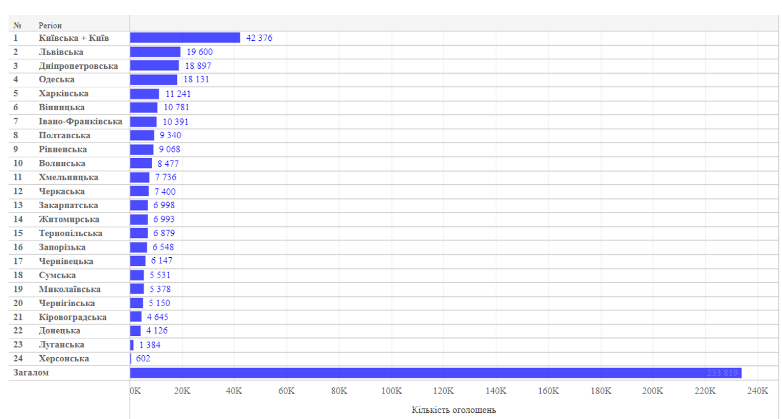 Найбільше оголошень розмістили у Київській області та Києві (42,4 тис.), Львівській (19,6 тис.), Дніпропетровській (18,9 тис.), Одеській (18,1 тис.) та Харківській (11,2 тис.) областях.