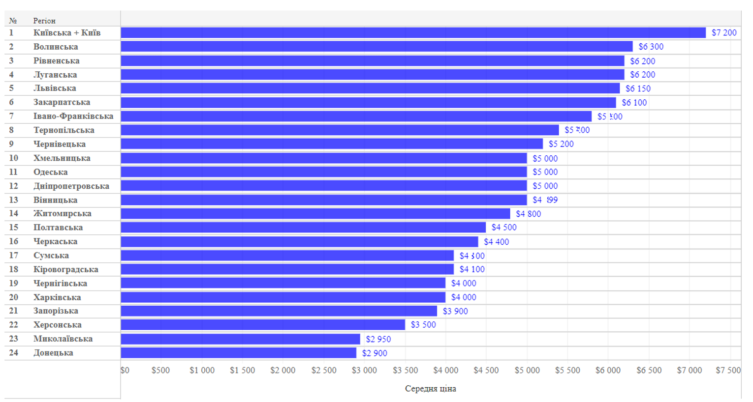 Найнижча середня вартість виявилася у Донецькій (3 300 дол. США), Миколаївській (3 450 дол. США), Херсонській (3 800 дол. США), Чернігівській (4 100 дол. США) та Запорізькій (4 500 дол. США) областях.