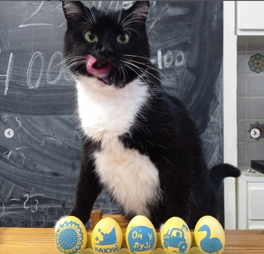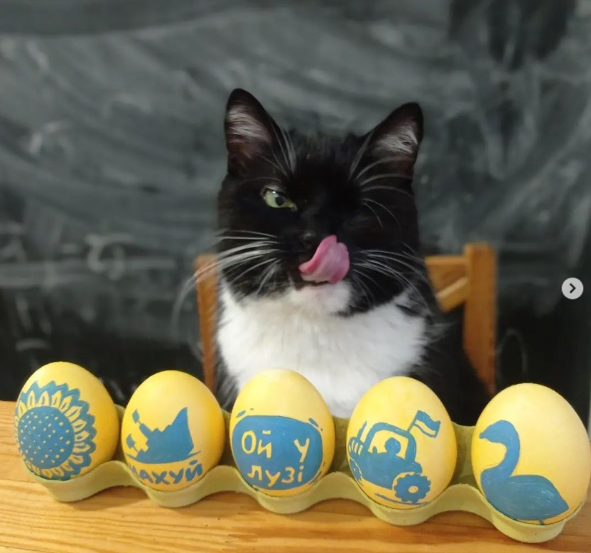 До Великодня котик взяв участь в патріотичні фотосесії з крашанками.