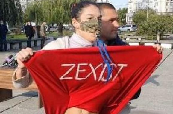 Вона підняла поділ спідниці, де білими літерами на червоному тлі розміщено напис "Zexist". При цьому інтимна частина тіла - пофарбована зеленкою.