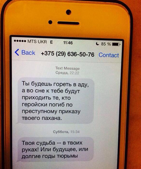 "Ти будеш горіти в пеклі, а у сні до тебе будуть приходити ті, хто героїчно загинув за злочинним наказом твого пахана. Твоя доля - в твоїх руках! Або майбутнє, або довгі роки тюрми", - такі смс отримали регіонали.