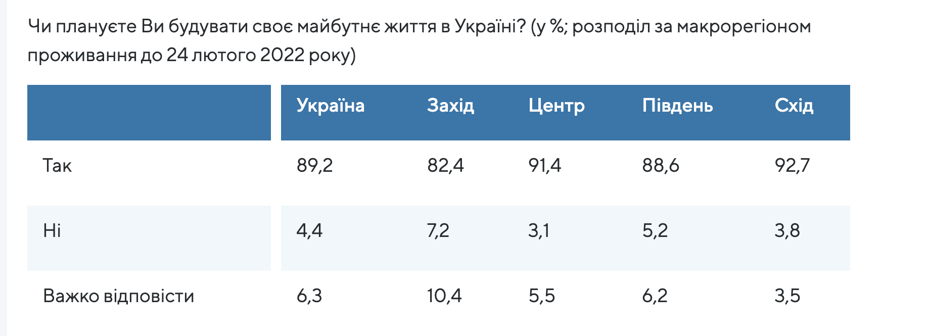 Так, своє майбутнє життя в Україні хочуть будувати 89% респондентів. Це стосується тих, хто лишився в Україні до сьогодні, оскільки опитування не проводилося серед громадян, які виїхали за кордон після початку повномасштабного вторгнення.