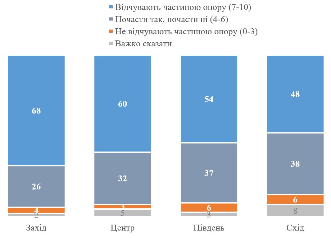 68% мешканців Заходу відчувають себе частиною національного опору. Ще 26% відчувають себе хоча б частково долученими до опору ворогові, а 4% респондентів скоріше або абсолютно не відчувають себе частиною опору.