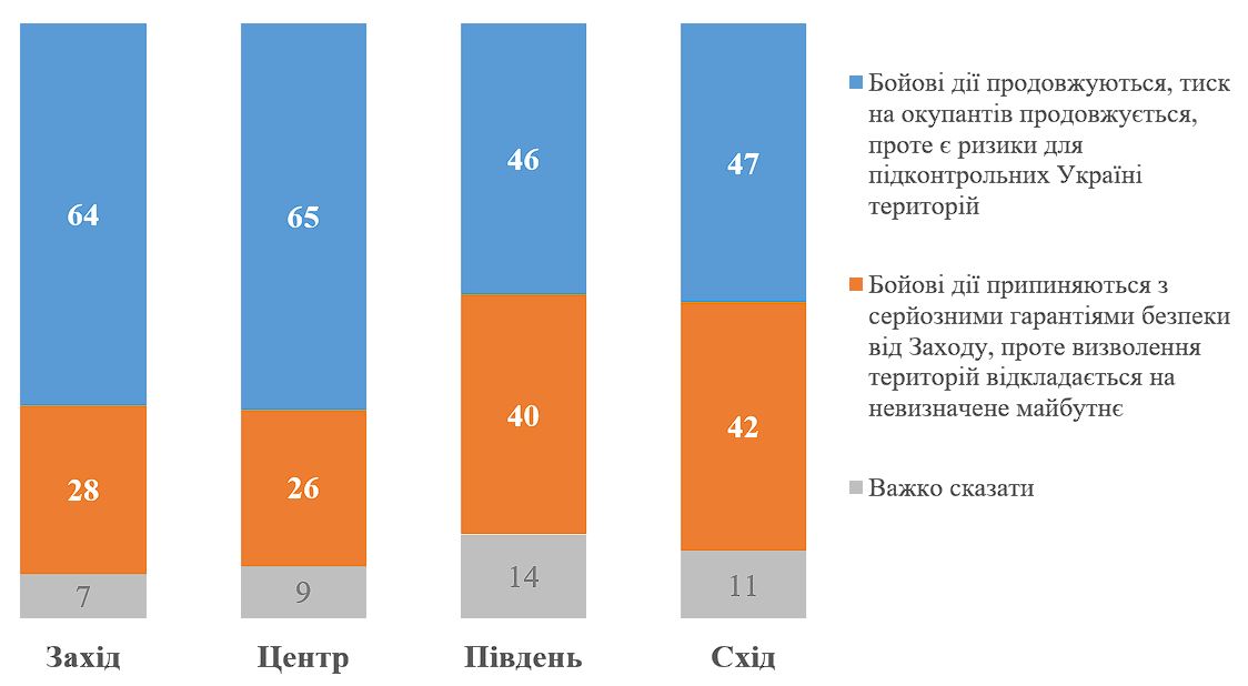 Натомість на Півдні та Сході думки розділилися приблизно навпіл з лише незначним переважанням думки про продовження бойових дій. Так, на Півдні 46%, а на Сході 47% вважають, що навіть в умовах обмеженої Західної допомоги бойові дії мають продовжуватися.