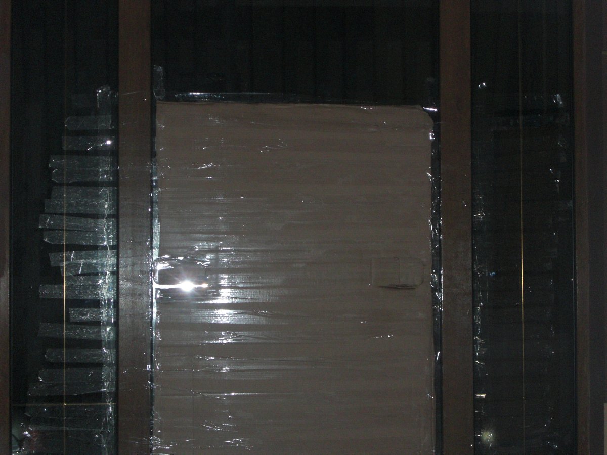 Вікно розбили з боку вулиці Труша. Наразі дірку прикрили картонним папером, який приліпили скотчем.