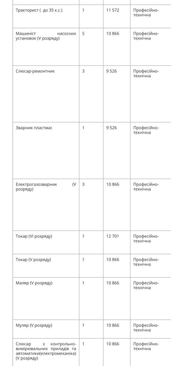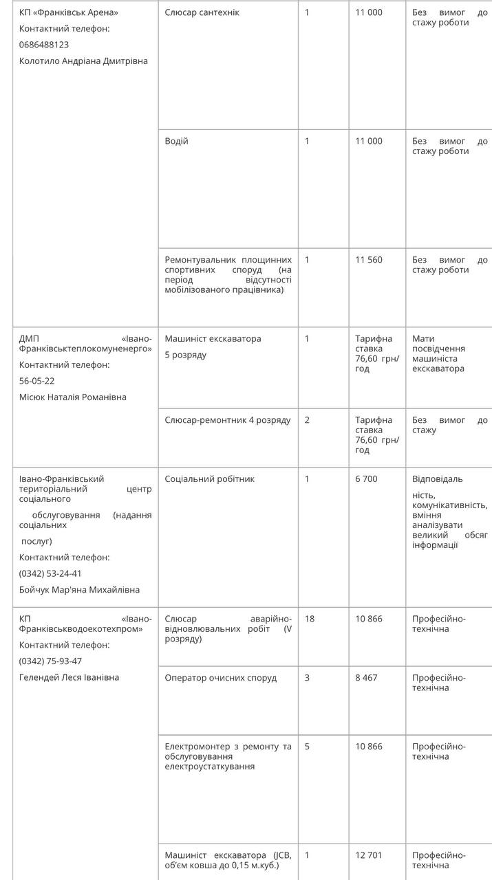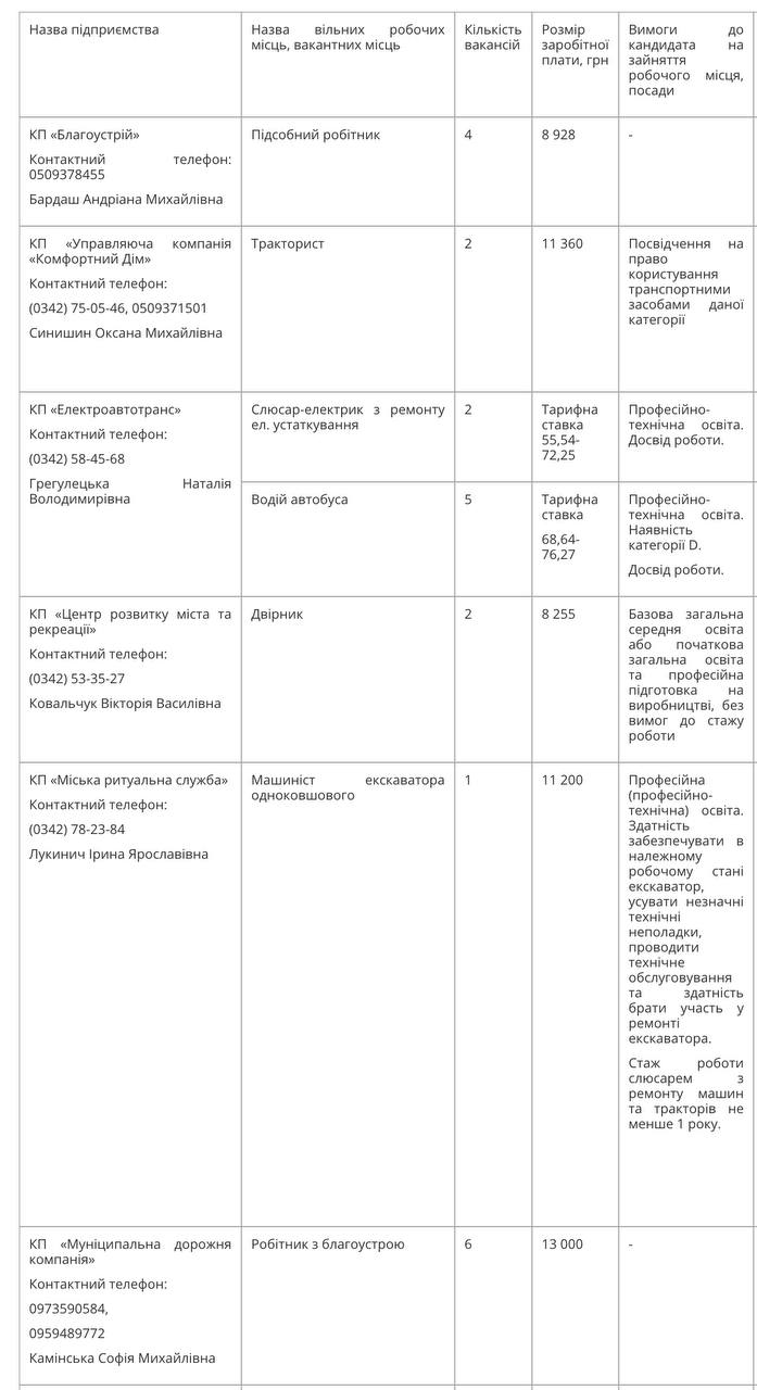 Окрім того, серед вакантних посад: робітники з благоустрою, асфальтобетонники, підсобні працівники, слюсарі-електрики, водії автобусів та інші.