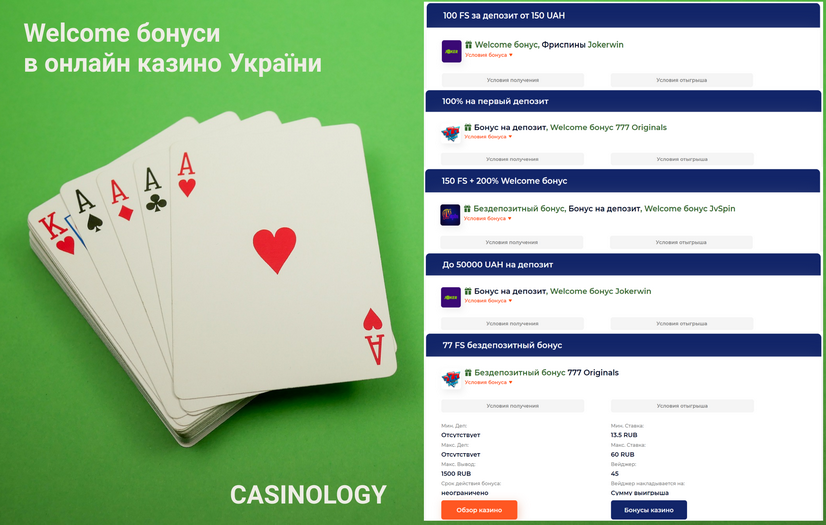 В рейтингах Casinology можна побачити найпопулярніші казино з їх бонусами за реєстрацію, детальними умовами отримання подарунка, розміром вейджеру та іншими подробицями.