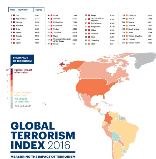 Згідно із "Глобальним рейтингом тероризму-2016" Інституту економіки й миру, Україна найбільше потерпає від тероризму серед держав Європи.
