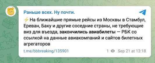 Зокрема, на 21 вересня розпродано всі квитки на прямі рейси за найпопулярнішими напрямками, включаючи Єреван та Стамбул. Але, як стверджують у Кремлі, паніки немає...