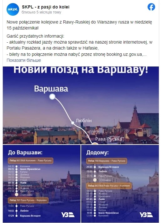 Поїзд SKPL відправлятиметься з Рави-Руської о 10.30 і зупинятиметься в Любліні о 14.55 за польським часом (GMT+2). Він завершить свій маршрут на станції Варшава Східна о 17.29. Зворотно поїзд відправлятиметься з цієї ж станції о 21.45 і прибуватиме до Львова о 7.45 наступного дня.