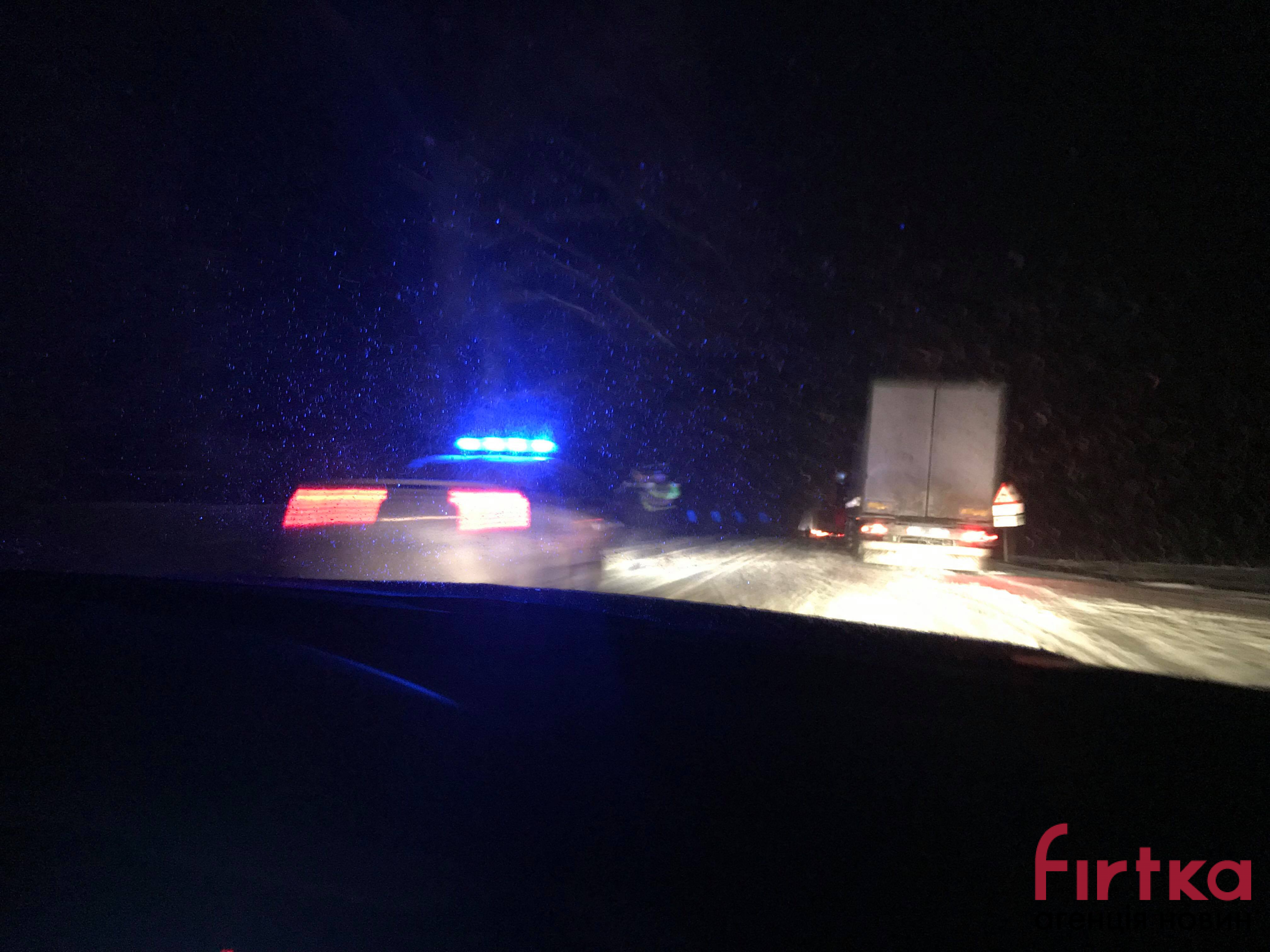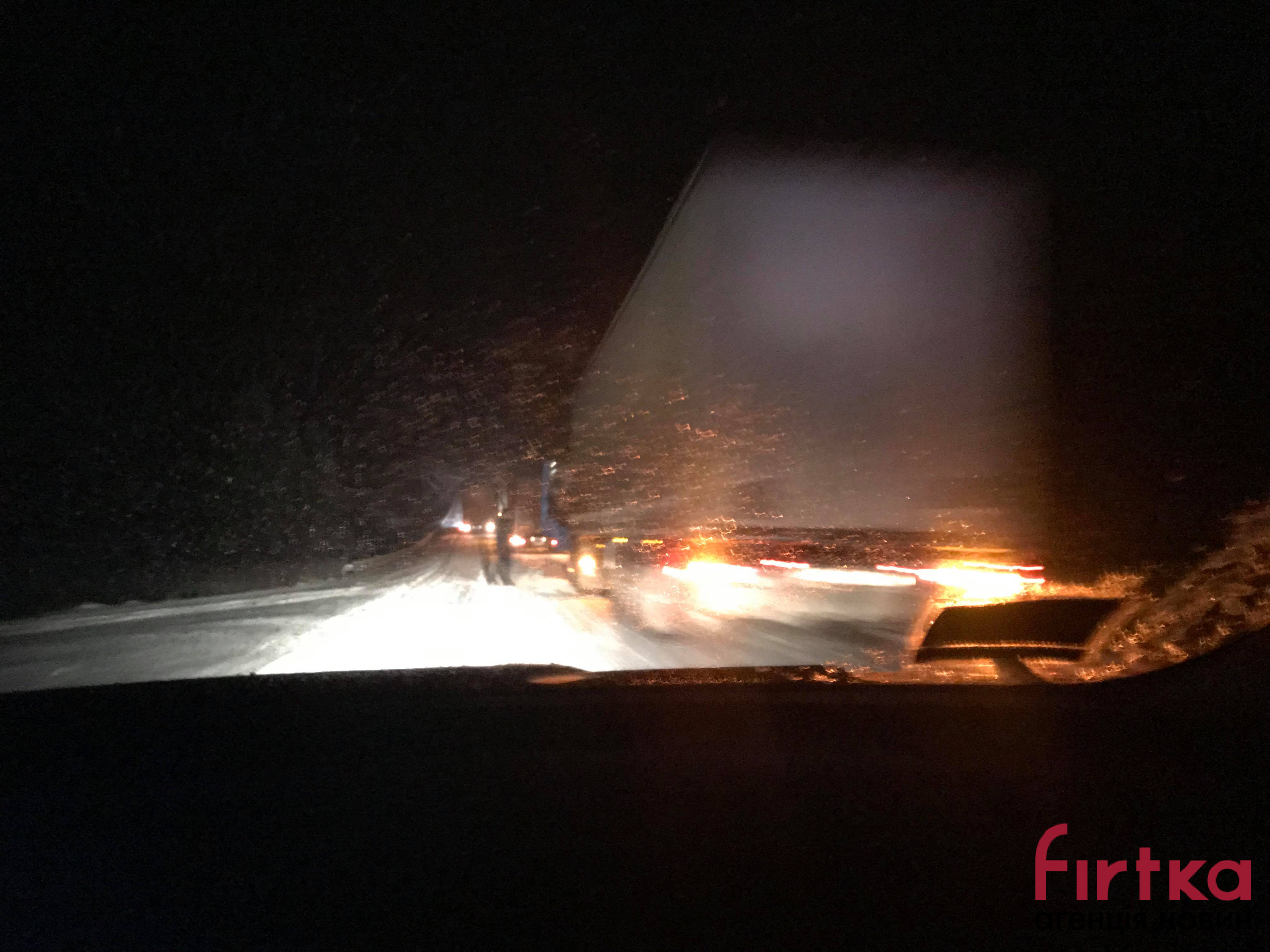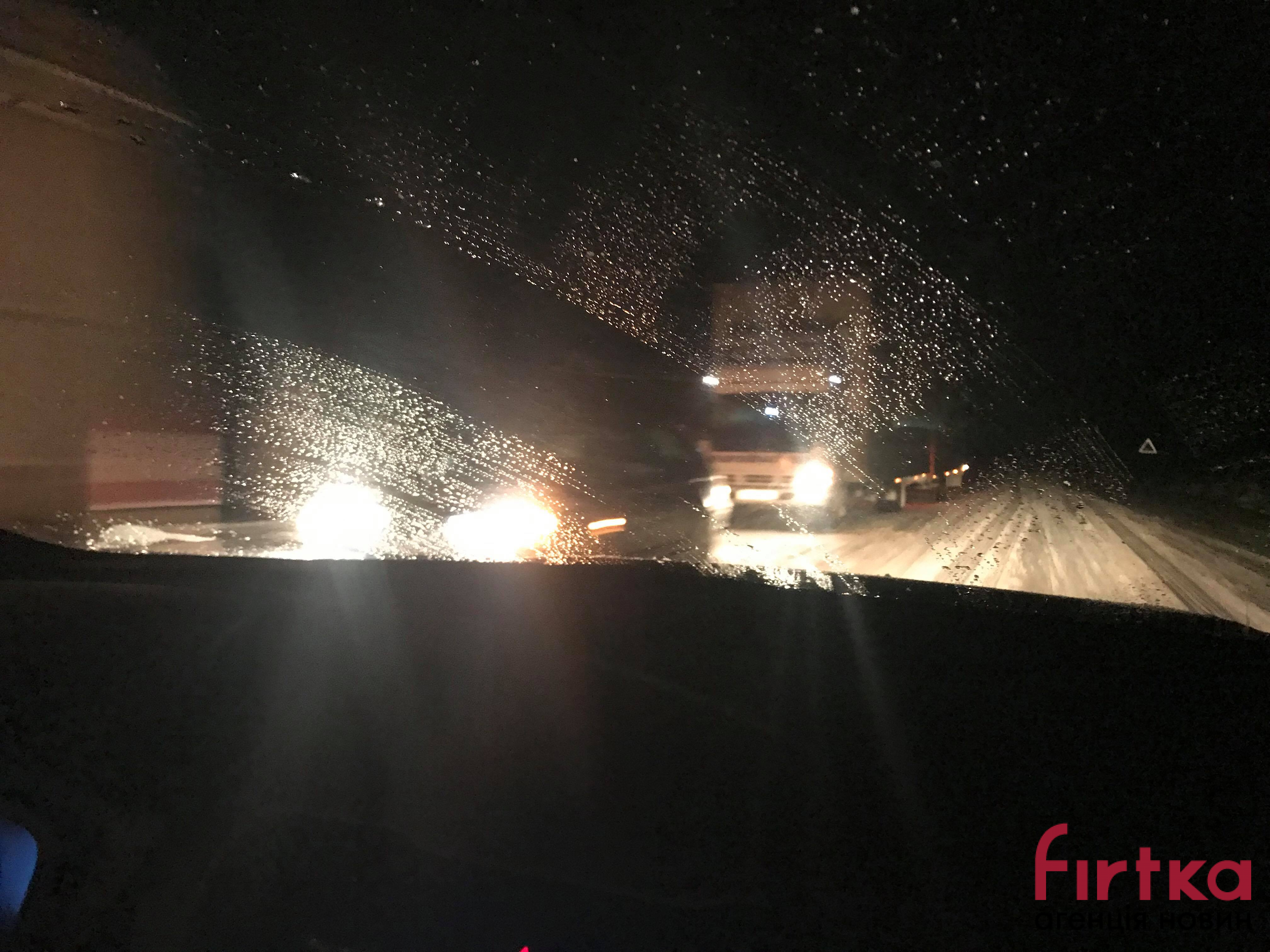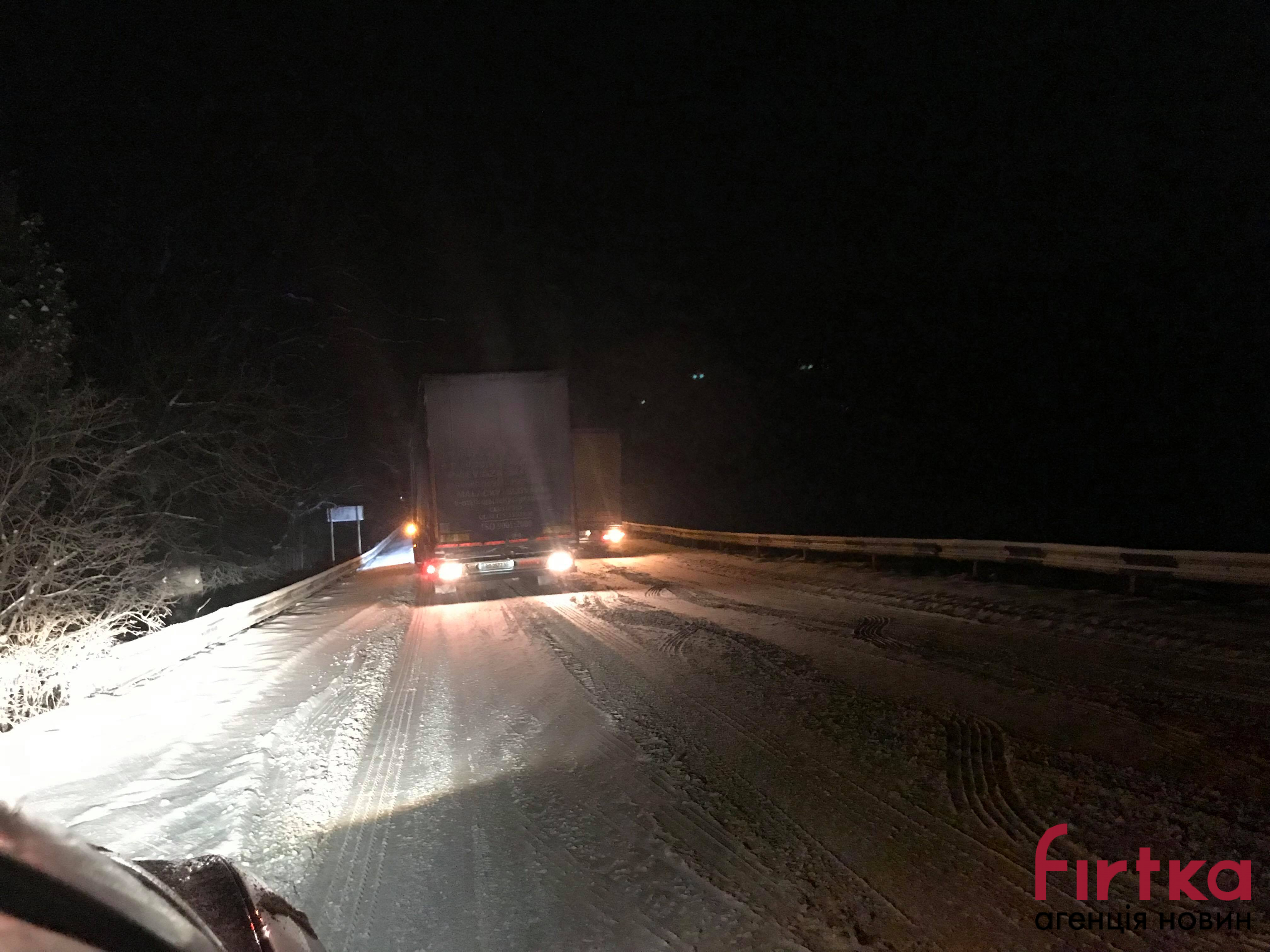 Такі непрості погодні умови привели до того, що на підйомі в селі Олешів вантажівки не можуть виїхати. Внаслідок цього наразі спостерігається ускладнення руху на трасі Івано-Франківськ- Тернопіль. Працює поліція.