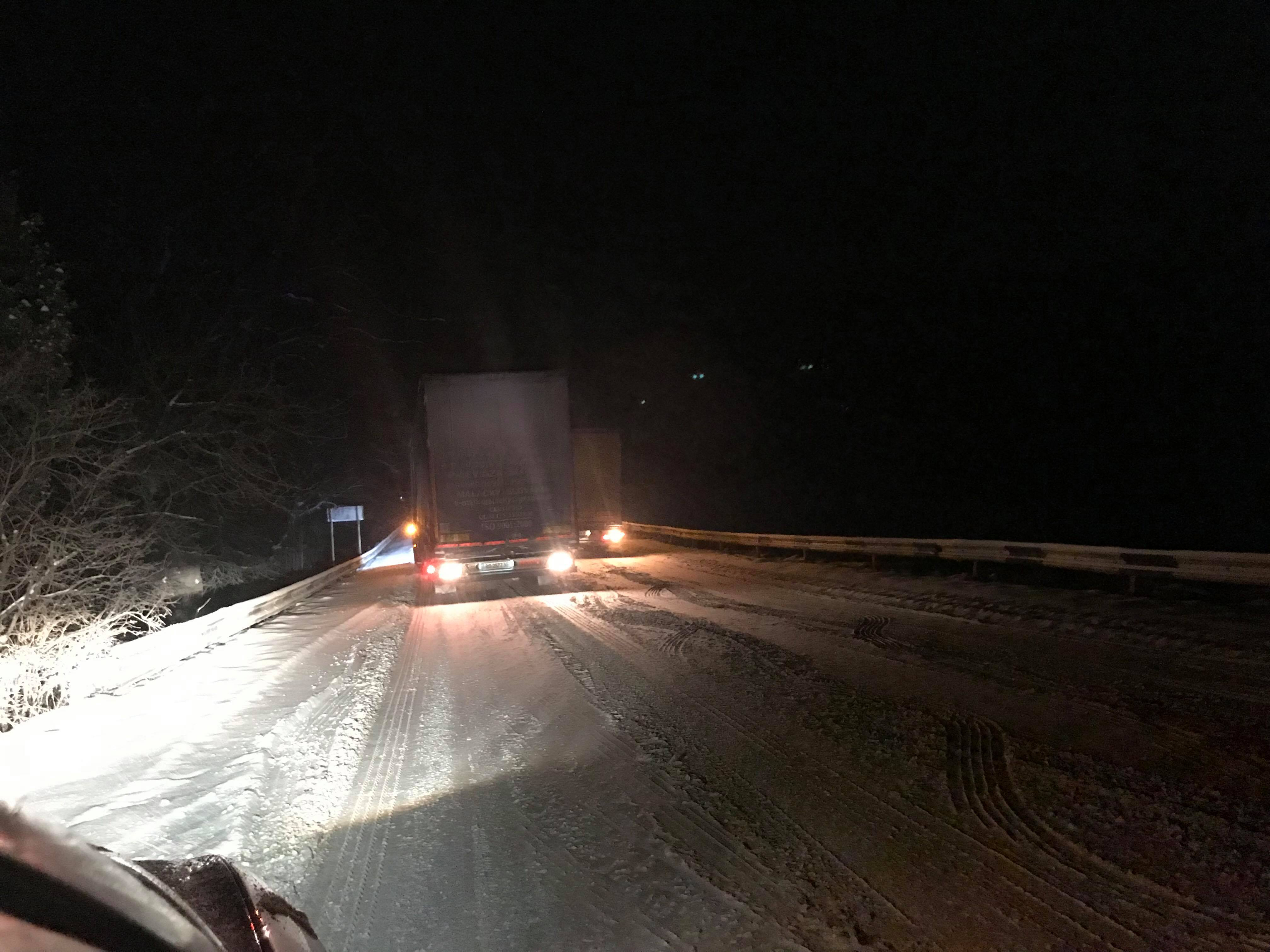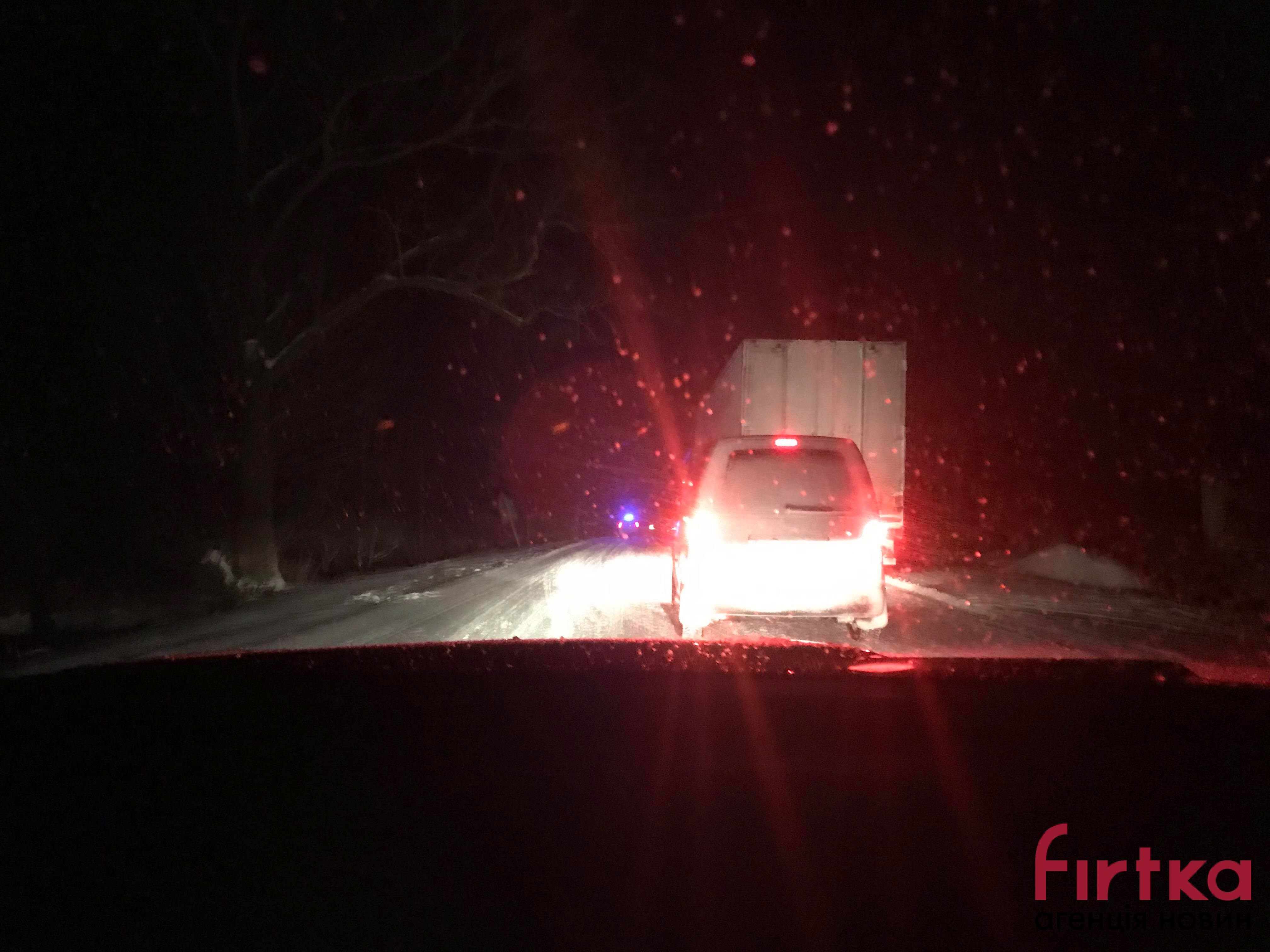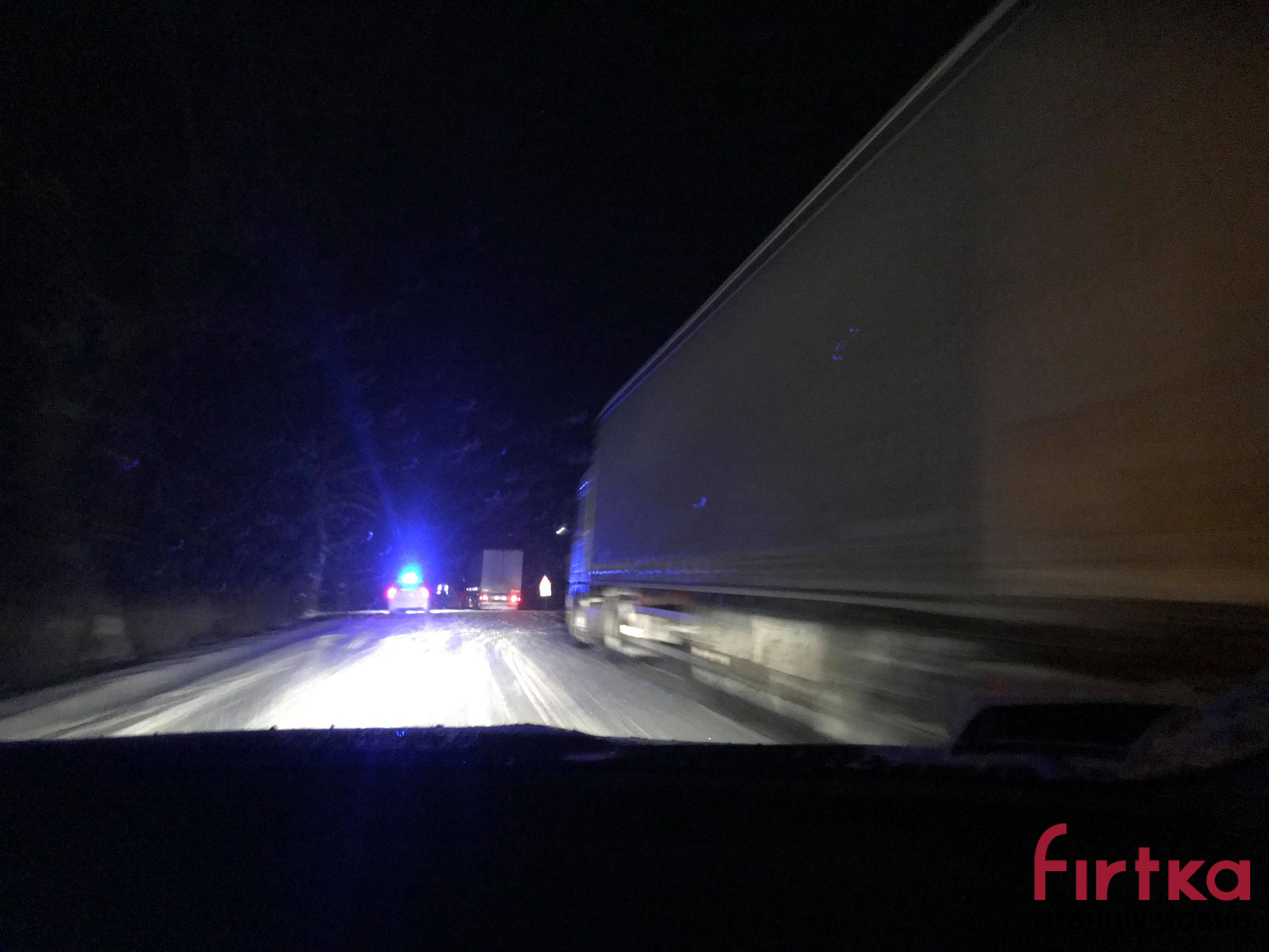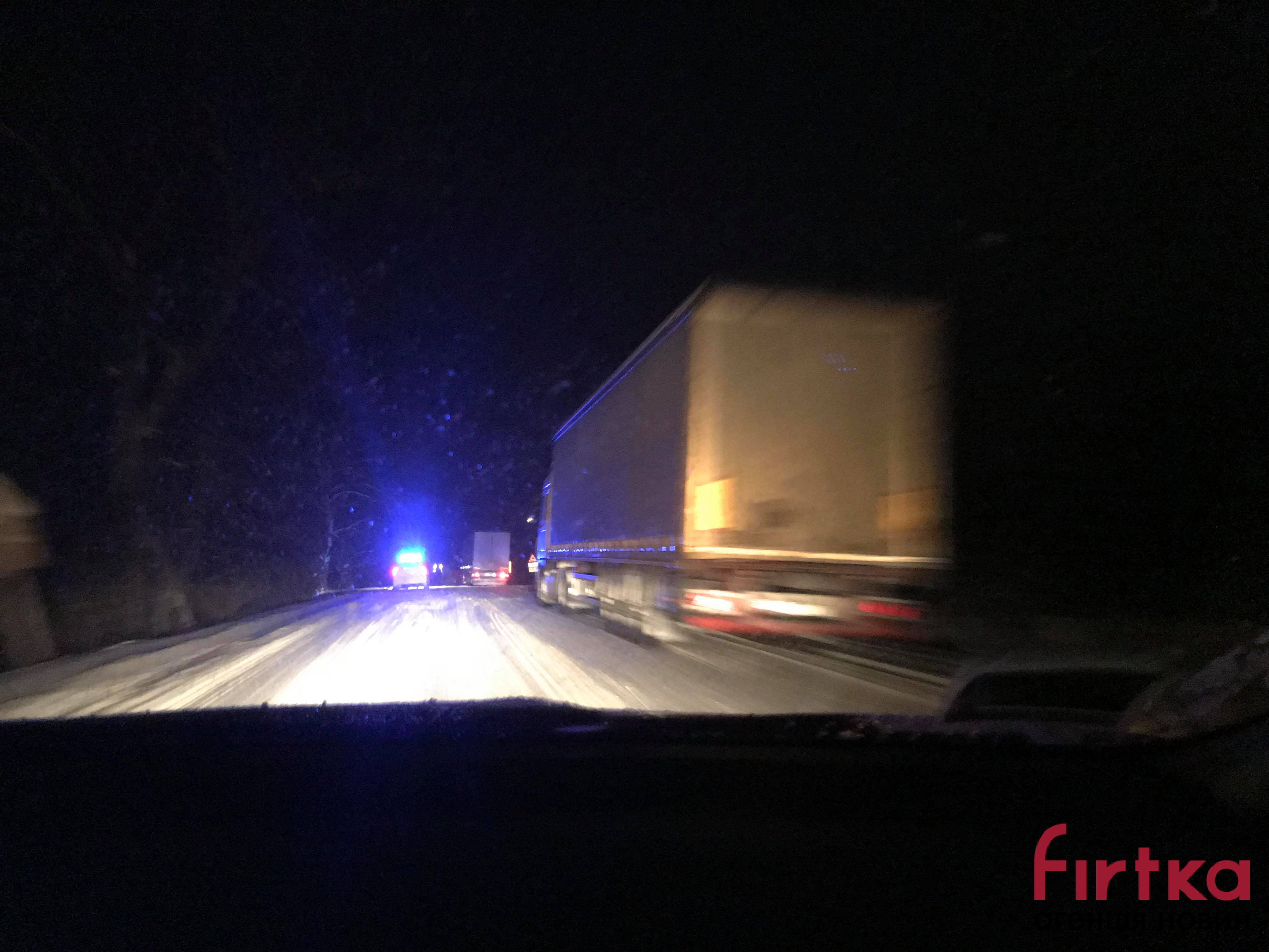 Такі непрості погодні умови привели до того, що на підйомі в селі Олешів вантажівки не можуть виїхати. Внаслідок цього наразі спостерігається ускладнення руху на трасі Івано-Франківськ- Тернопіль. Працює поліція.