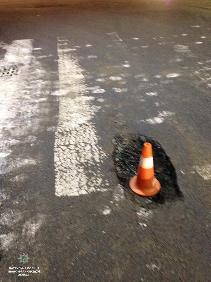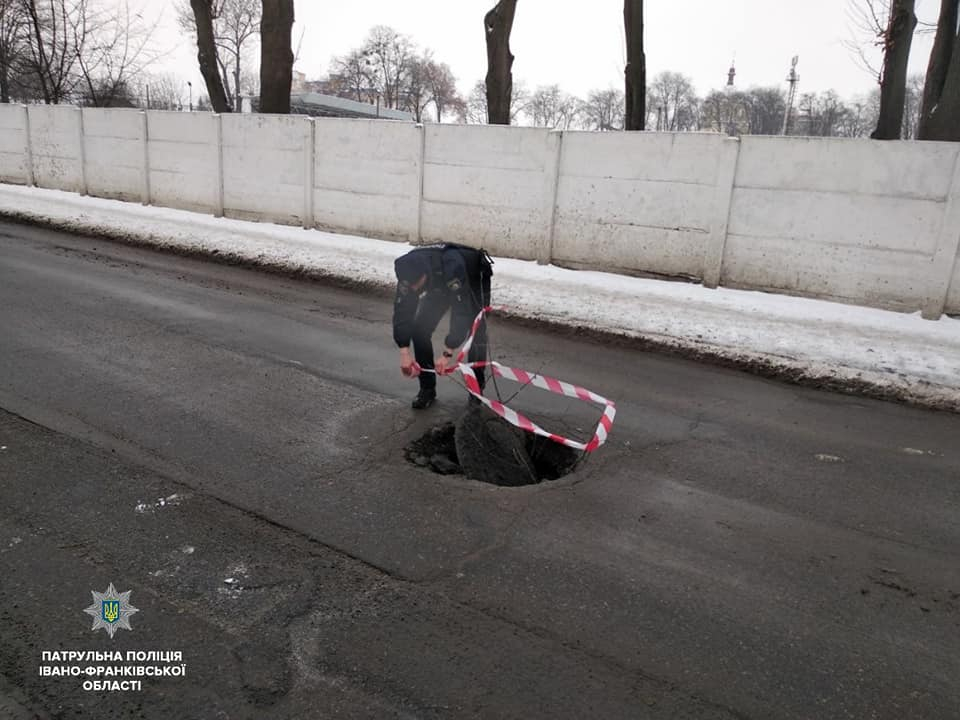 "До управління патрульної в Івано-Франківській області та на телефонну лінію 102 надходять скарги на незадовільний стан вулиць в обласному центрі. Через поганий стан доріг виникають аварійні ситуації, дорожньо-транспортні пригоди, а власники автомобілів несуть матеріальні витрати. Тільки від початку 2019 року працівники УПП опрацювали п’ять ДТП, причиною яких стали наїзди на яму чи вибоїну", - пишуть патрульні.