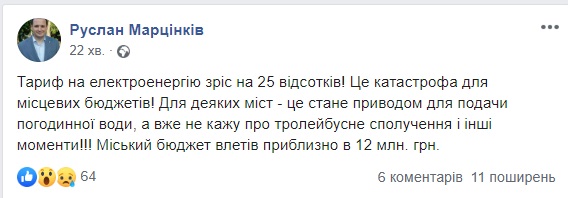 "Це катастрофа для місцевих бюджетів! Для деяких міст - це стане приводом для подачі погодинної води, я вже не кажу про тролейбусне сполучення і інші моменти!!! Міський бюджет влетів приблизно в 12 млн грн", - повідомив міський очільник.
