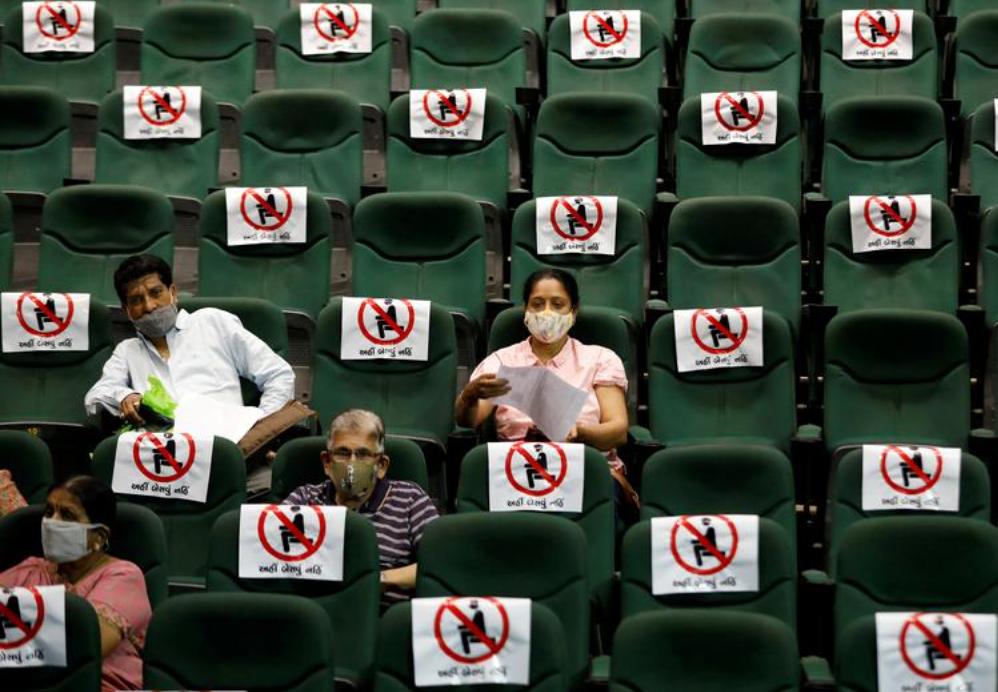 Люди сидять під спостереженням, отримавши дозу вакцини проти коронавірусу COVISHIELD (COVID-19), яка вироблена в Інституті сироватки крові в Індії, в залі, який переобладнали на тимчасовий центр вакцинації в Ахмедабаді, Індія, 16 березня 2021. REUTERS/Аміт Дейв