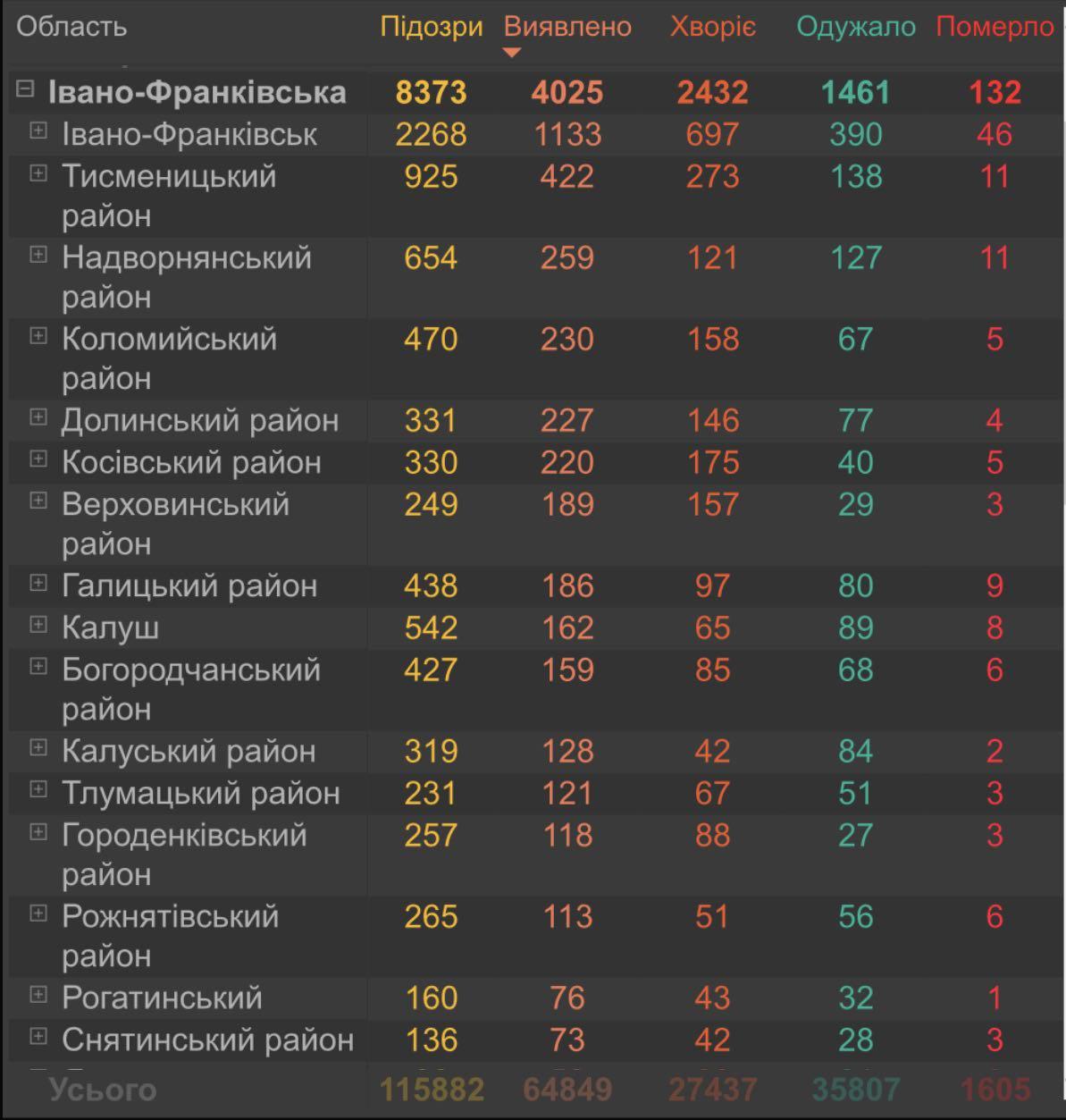 Наразі в області є 8 373 підозри на коронавірусну хворобу. Загалом хворіють 2 432 прикарпатці. Крім того, одужали 1 461 прикарпатці.
