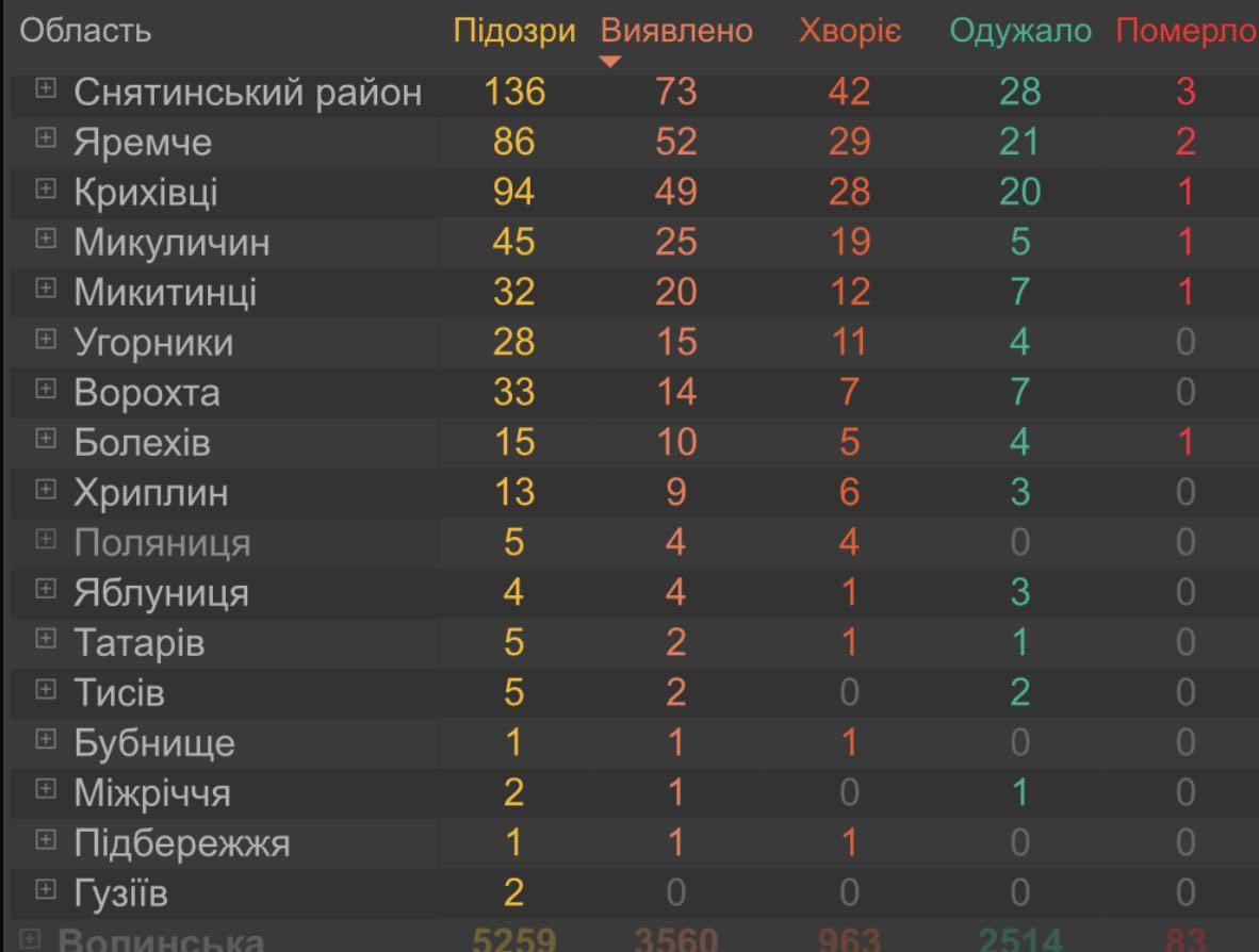 Найменша кількість хворих у Снятинському районі – 73, та Рогатинському – 76.