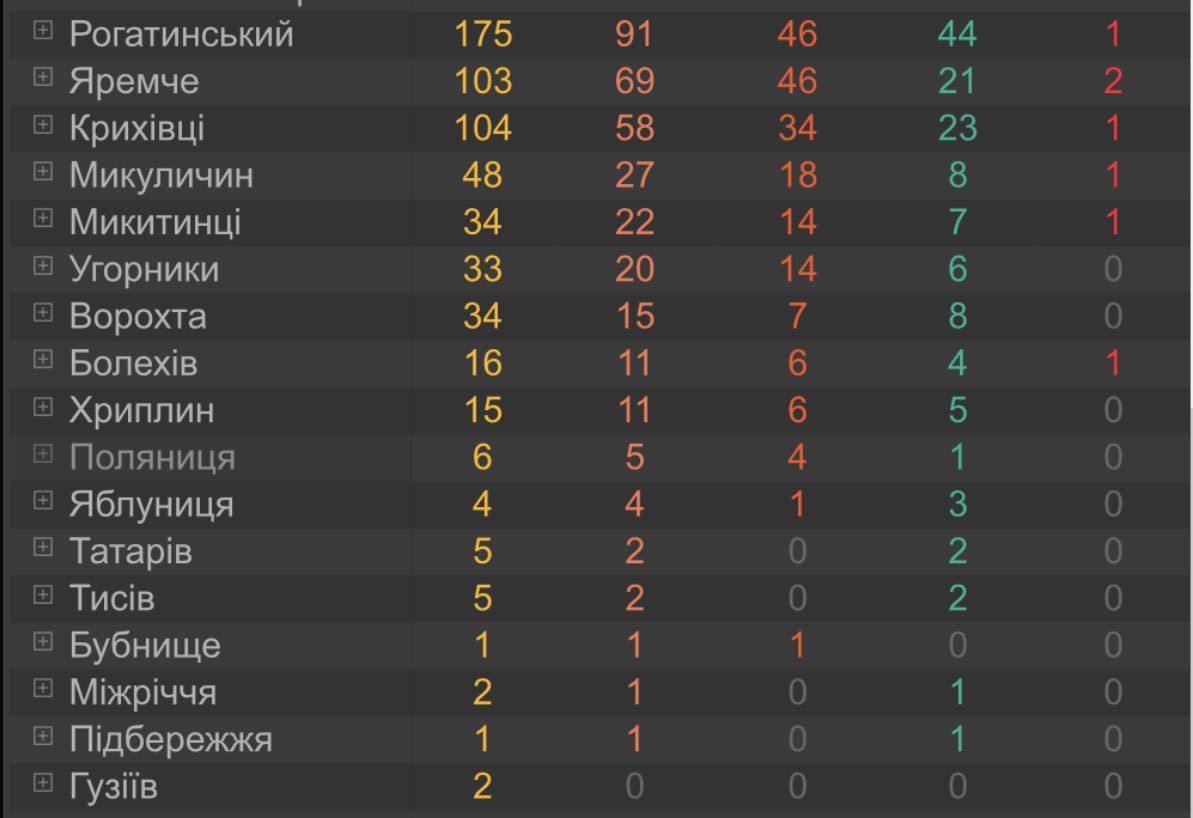 Найменша кількість хворих у Снятинському районі – 96 та Рогатинському – 91.