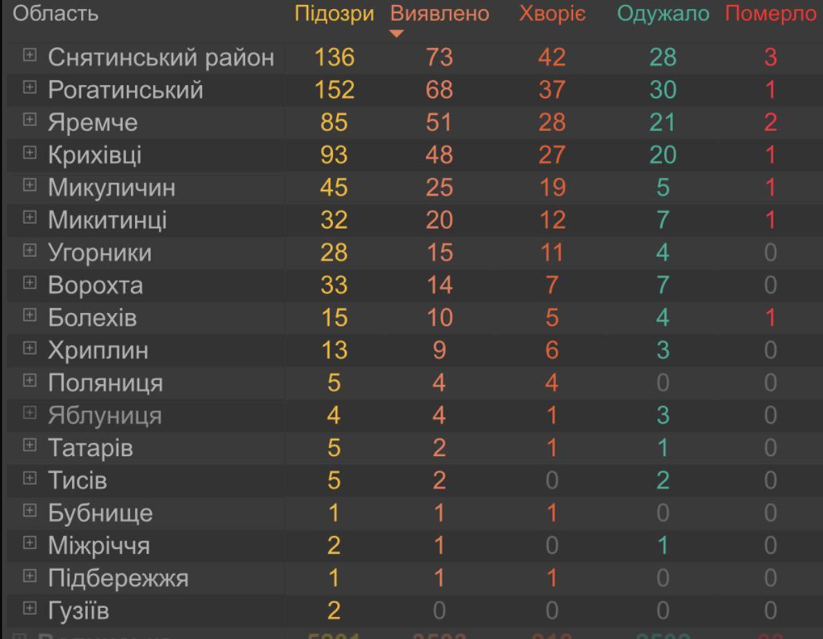 Найменша кількість хворих у Снятинському районі – 105 та Рогатинському – 97.