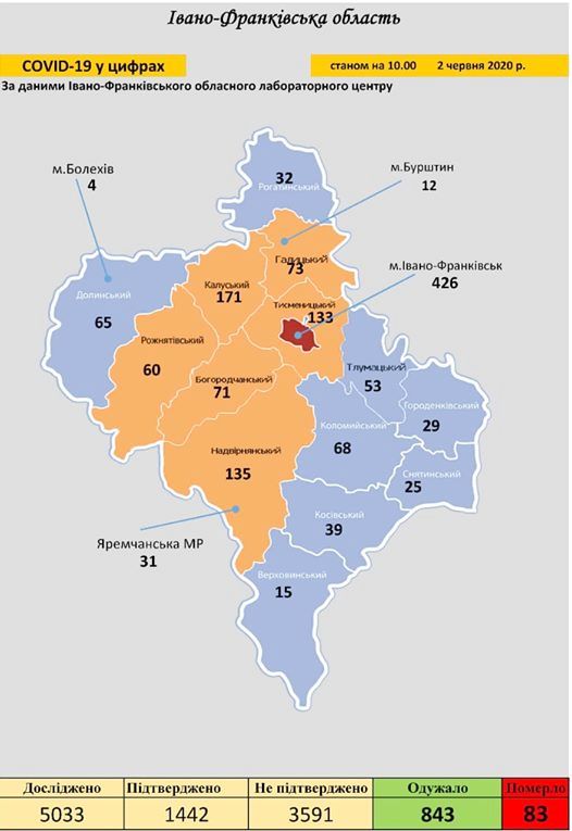 Зокрема, в області вже 1 442 лабораторно підтверджених випадків захворювання - 22 нових за добу, пише Фіртка з посиланням на пресслужбу Івано-Франківської ОДА.