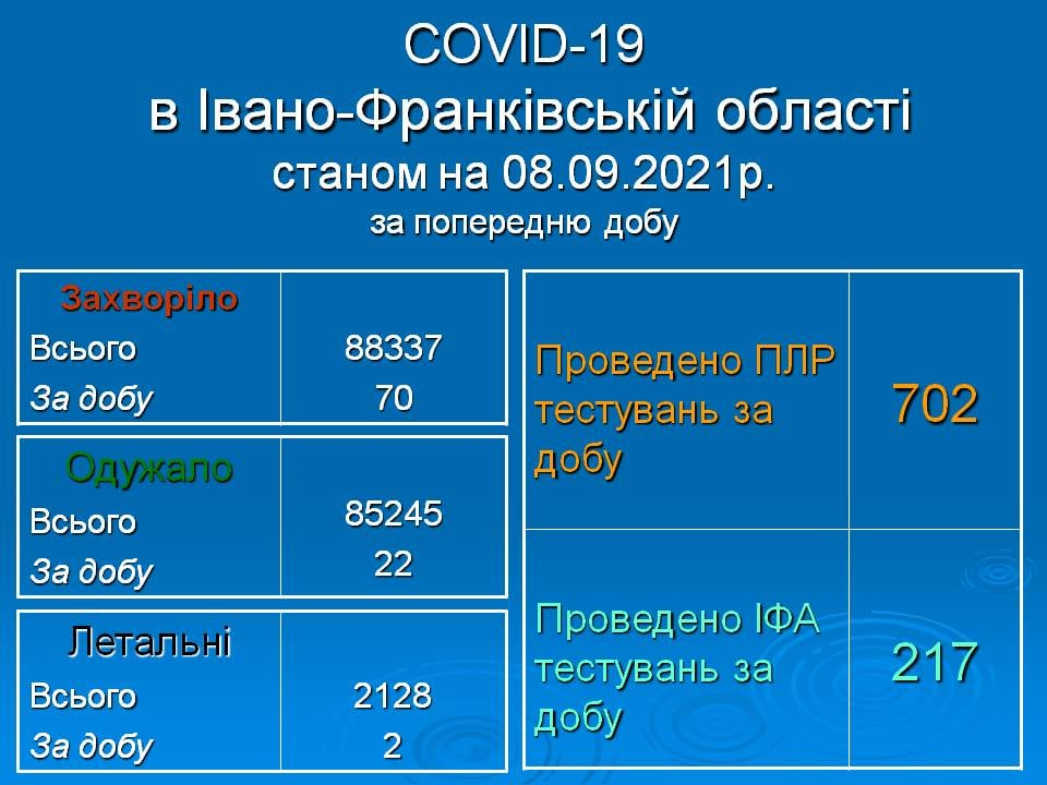 Станом на 8 вересня в Івано-Франківській області протягом попередньої доби зареєстровано 70 нових випадків коронавірусної хвороби COVID-19.