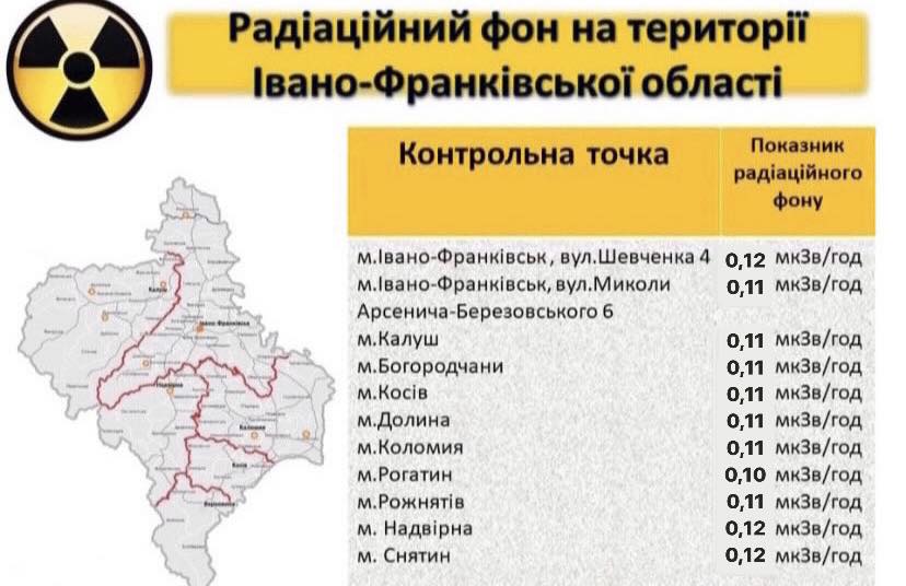 Тим часом найвищий радіаційний фон на Івано-Франківщині спостерігають у Надвірній, Снятині та в Івано-Франківську. Зокрема, він становить 0,12 мкЗв/год.