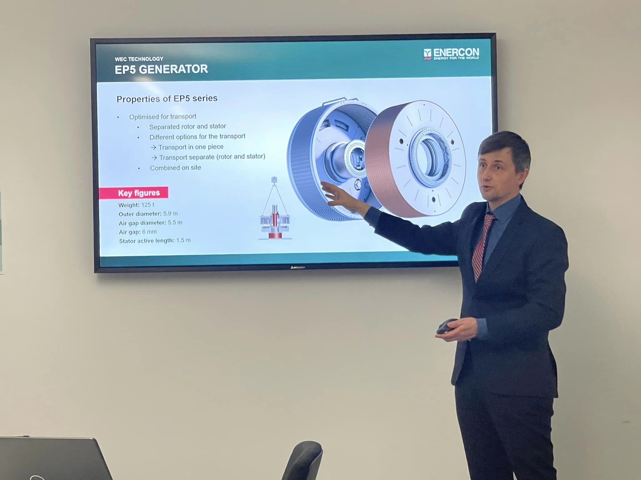 Ян-Бернард Мантай розповів, що компанія Енеркон надає унікальні послуги, виробляє, монтує та проводить гарантійний супровід вітряків, яких працює по світу, від Чилі до В’єтнаму, вже десятки тисяч. Окупність вітряків складає сім років, при тому, що період роботи вітряка без втручань складає 25 років.
