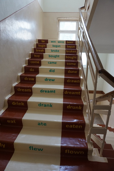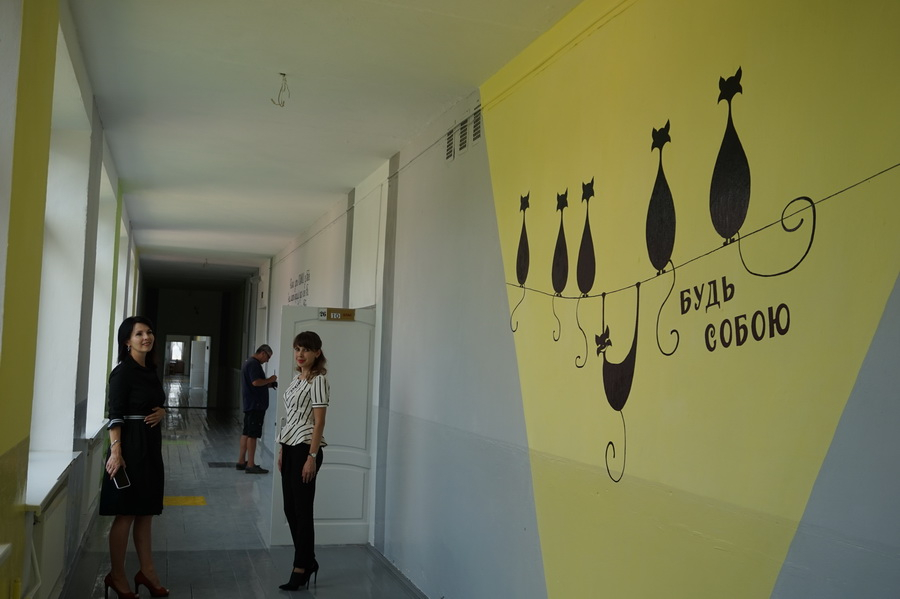 Починаючи з коридорів, де на сходах між поверхами найнеобхідніші правила української та англійської. Так-так, ті самі неправильні дієслова, наприклад, які більшість з нас не надто успішно намагались завчити напам’ять у шкільні роки. А на стінах – мотивуючі малюнки, що демонструють цінність особистості кожної дитини. Їх у період канікул роблять самі вчителі та працівники школи.