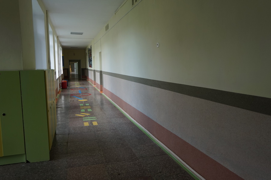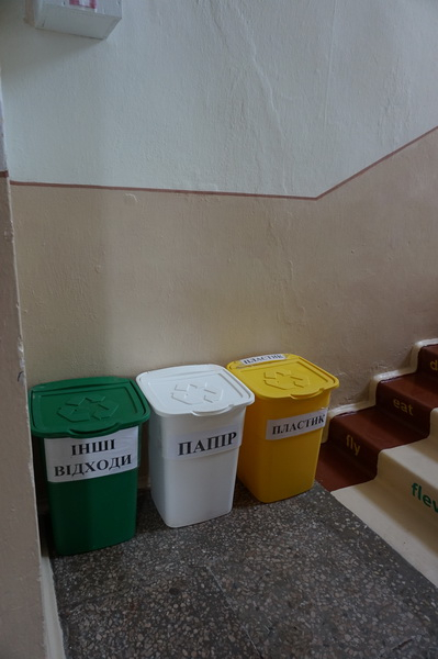 Йдемо далі і натрапляємо на кольорову розмітку на підлозі коридору поверху, де розташовані молодші класи, а також кольорові пуфи, на яких діти можуть відпочити за межами класу. Ще одна цікава деталь – на кожному з поверхів стоять контейнери для роздільного сортування сміття. Тут до цієї цивілізаційної навички мешканців привчають зі шкільних лав.