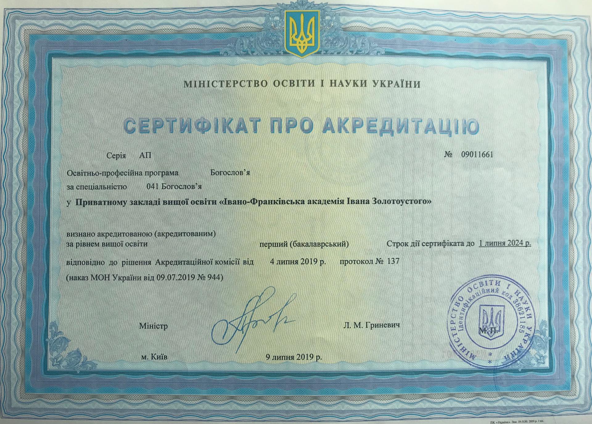 Державне визнання: Академія Івана Золотоустого отримала акредитацію спеціальності "Богослов'я" за освітнім ступенем "Бакалавр"