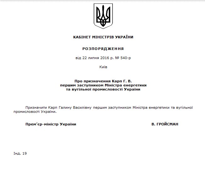 Першим заступником Міністра енергетики і вугільної промисловості призначили Галину Карп, директора фінансового департаменту Івано-Франківської обласної державної адміністрації, інформує Фіртка з посиланням на Урядовий портал.