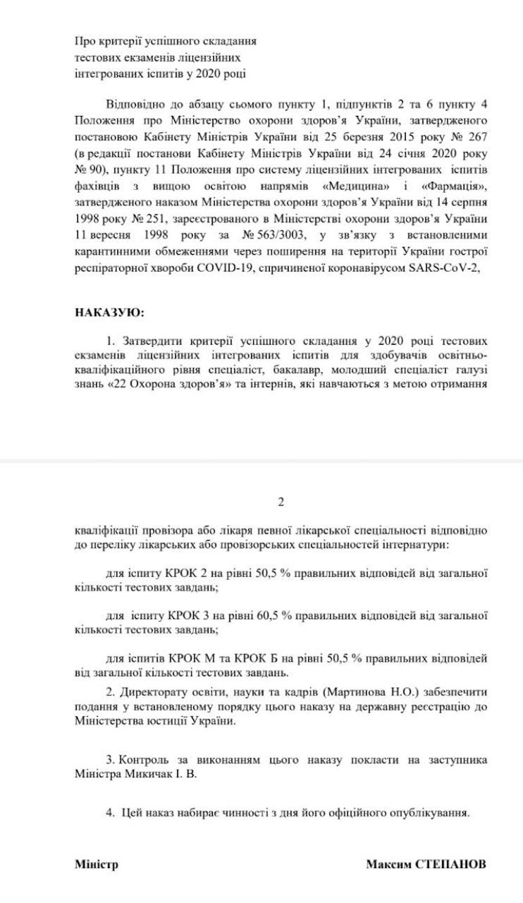 Міністерство охорони здоров'я зареєструвало проєкт наказу, в якому йдеться про зниження на 10% прохідного балу "Крок-2" та "Крок-3" – іспитів для студентів-медиків.