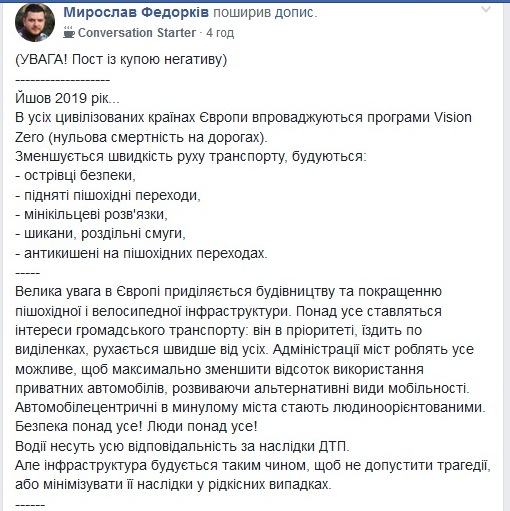 "В усіх цивілізованих країнах Європи впроваджуються програми Vision Zero (нульова смертність на дорогах). Зменшується швидкість руху транспорту, будуються острівці безпеки, підняті пішохідні переходи, мінікільцеві розв'язки, шикани, роздільні смуги, антикишені на пішохідних переходах. Велика увага в Європі приділяється будівництву та покращенню пішохідної і велосипедної інфраструктури. Понад усе ставляться інтереси громадського транспорту: він в пріоритеті, їздить по виділенках, рухається швидше від усіх. Адміністрації міст роблять усе можливе, щоб максимально зменшити відсоток використання приватних автомобілів, розвиваючи альтернативні види мобільності. Автомобілецентричні в минулому міста стають людиноорієнтованими. Безпека понад усе! Люди понад усе! Водії несуть усю відповідальність за наслідки ДТП. Але інфраструктура будується таким чином, щоб не допустити трагедії, або мінімізувати її наслідки у рідкісних випадках", - написав посадовець.