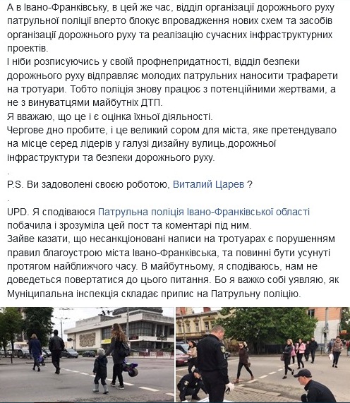 "І ніби розписуючись у своїй профнепридатності, відділ безпеки дорожнього руху відправляє молодих патрульних наносити трафарети на тротуари. Тобто поліція знову працює з потенційними жертвами, а не з винуватцями майбутніх ДТП. Я вважаю, що це і є оцінка їхньої діяльності. Чергове дно пробите, і це великий сором для міста, яке претендувало на місце серед лідерів у галузі дизайну вулиць,дорожньої інфраструктури та безпеки дорожнього руху. В майбутньому, я сподіваюсь, нам не доведеться повертатися до цього питання. Бо я важко собі уявляю, як Муніципальна інспекція складає припис на Патрульну поліцію", - додав Федорків.