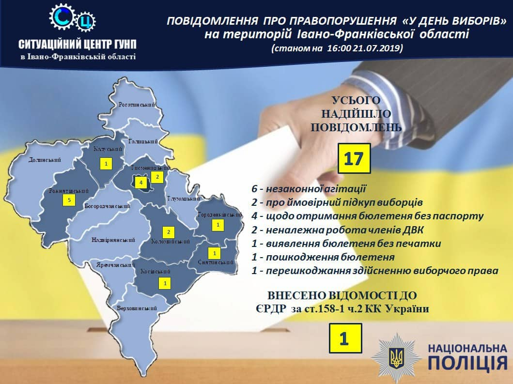 Про це інформує Фіртка з посиланням на ГУ НП в Івано-Франківській області. Йдеться про такі повідомлення: 6 випадків незаконної агітації, 2 про підкуп виборців, 4 отримання бюлетеня без паспорта, 2 неналежна робота членів ДВК, 1 виявлення бюлетеня без печатки, 1 пошкодження бюлетеня та 1 перешкоджання здійсненню виборчого права. За цими повідомлення триває перевірка.