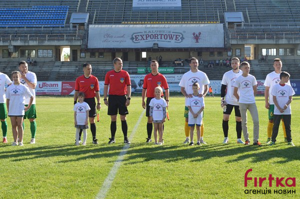 Матч в Івано-Франківську за вже доброю традицією розпочався з виходу гравців обох команд на поле МЦС "Рух" разом з дітками учасників АТО. І одні й другі були одягнуті в футболки з символікою "Учасник АТО - Герой України".