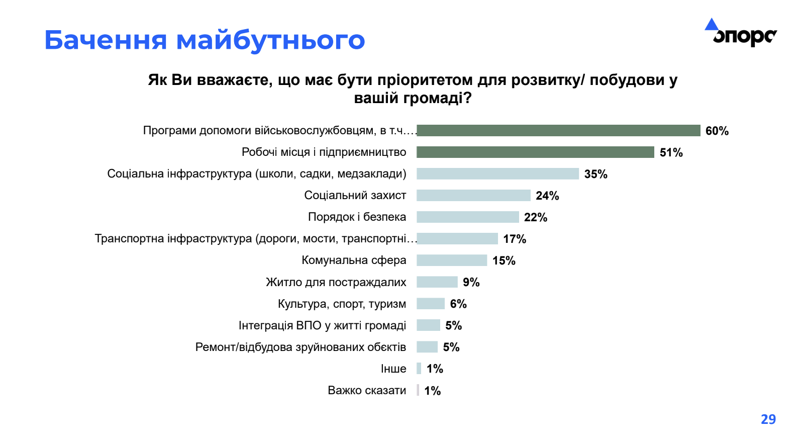 За результатами дослідження, місцева громада бачить наступну п'ятірку пріоритетів розвитку громади: