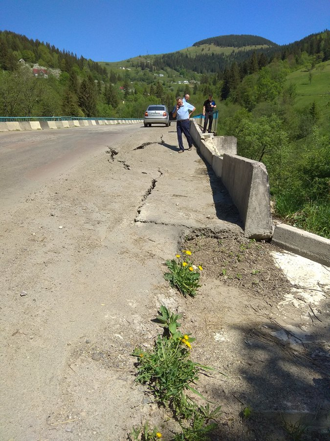"Торік під мостом утворився зсув. Його спричинило джерело з неконтрольованим витоком води, яка підмиває підходи та земляне полотно під перехідними плитами мосту. Внаслідок чого зафіксовано просідання цих плит, — коментують в САД. — Увага до згадуваного мосту, як і до інших штучних споруд на дорогах державного значення області, є постійною. В попередні роки підрядна організація Служби автодоріг – філія «МЕД» Облавтодору – провела значний обсяг робіт із ремонту деформаційних швів, проїзної частини підходів до мосту. Однак досі не усунута основна причина просідання мосту – вода, яка далі створює проблеми, насамперед перезволожує земляне полотно. Через це утворився зсув у проїзній частині підходу до мосту".