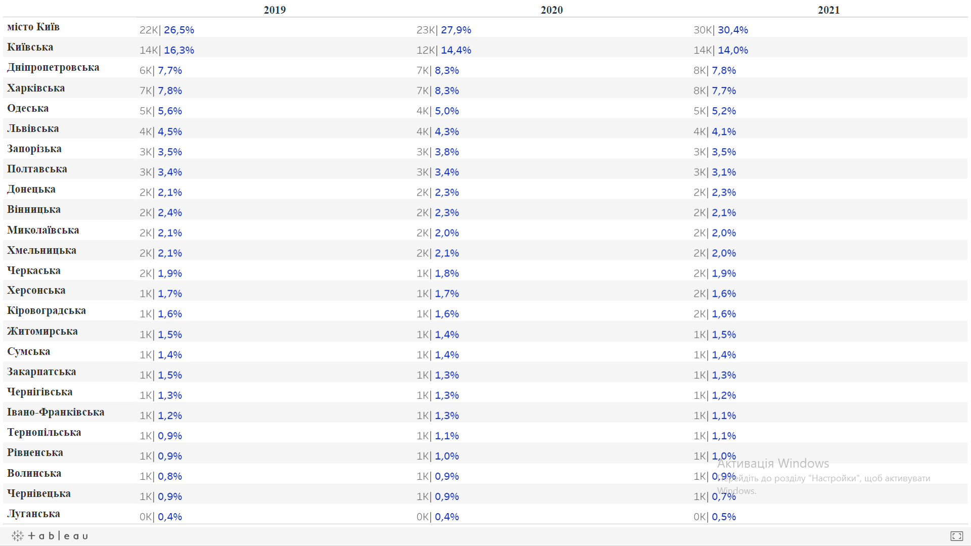 Як бачимо, загалом нові машини активніше купували у найбільших та найбагатших областях. Окрім найвищого в Україні економічного рівня розвитку, значна частка Києва та області може бути зумовлена також великою кількістю автосалонів та реєстрації ними автомобілів по запиту клієнтів.